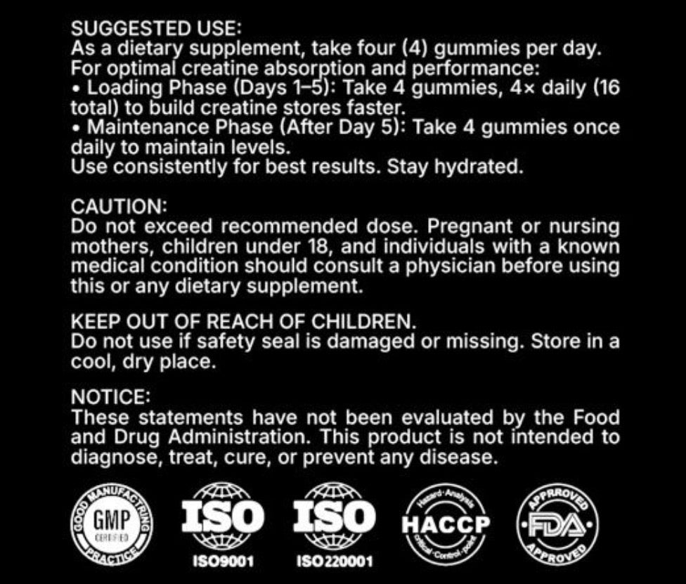 La forma más rica y conveniente de tomar creatina a diario. Cada 4 gummies aportan 5g de creatina monohidratada pura, ayudando a aumentar tu fuerza, mejorar tu recuperación y optimizar tu rendimiento—sin mezclar polvos ni usar shaker.